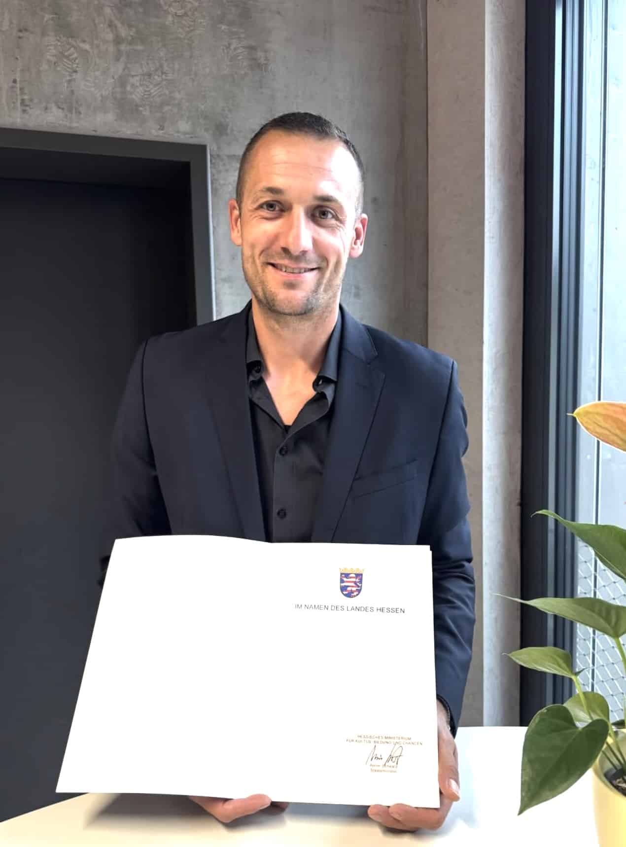 Zum 01. Oktober 2025 wurde Herr Catta offiziell zum Schulleiter unserer Schule ernannt. Die Übergabe der Urkunde erfolgte am 18.09. im Rahmen der Gesamtkonferenz durch Frau Roth-Sonnen vom Staatlichen Schulamt für den Landkreis Darmstadt-Dieburg und die Stadt Darmstadt. Herzlichen Glückwunsch, Herr Catta!